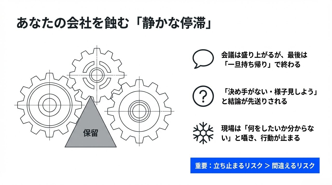 多くの経営者は、「間違った判断をしたくない」という一心で慎重になります。しかし、中堅・中小企業にとって最も危険なのは、判断ミスそのものよりも、「正解が見えるまで動かない」という停止状態です。