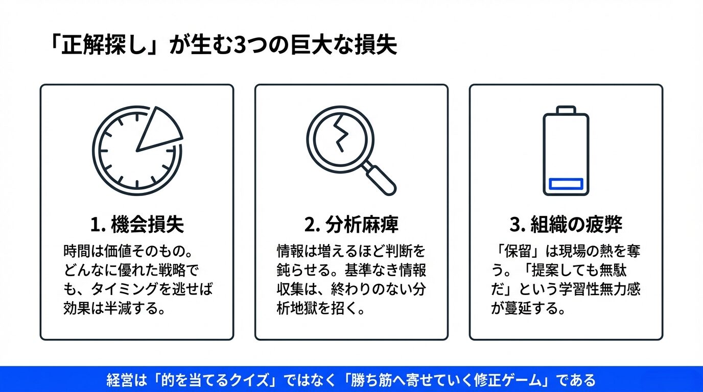 私がコンサルティングの現場で目撃してきた、「正解が見つかるまで検討を続ける」ことの弊害は、主に以下の3点に集約されます。