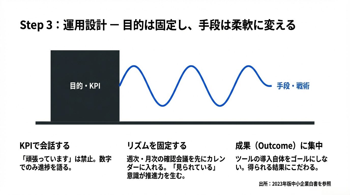 うまくいかない時、手段(戦術)を変えるのは当然です。しかし、目的(戦略的意図)までブレてしまうと現場は混乱します。「何のためにやっているのか」は常に固定し続けてください。 例えばDXにおいて、中小企業白書2023年版などの事例を見ても、成功している企業は「ツールを入れたこと」ではなく、「リードタイムが〇〇時間短縮された」「不良率が〇〇%改善した」という成果(Outcome)にこだわっています。導入をゴールにしないことが肝要です。