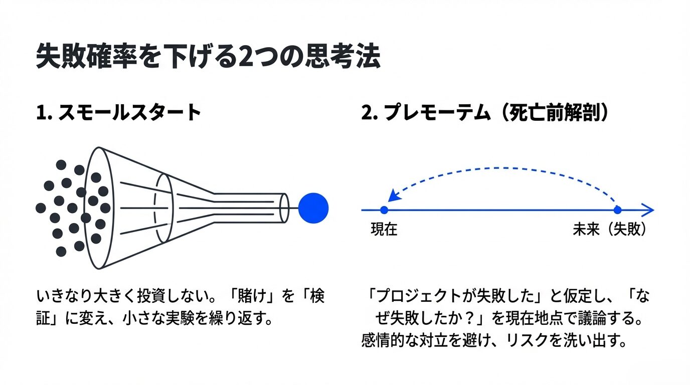 不確実性が高い案件ほど、最初から大きく投資してはいけません。「全店舗展開」の前に「1店舗で実験」、「システム全面刷新」の前に「一部門でプロトタイプ導入」。「賭け」を「検証」に変えることで、失敗のコストを最小化できます。