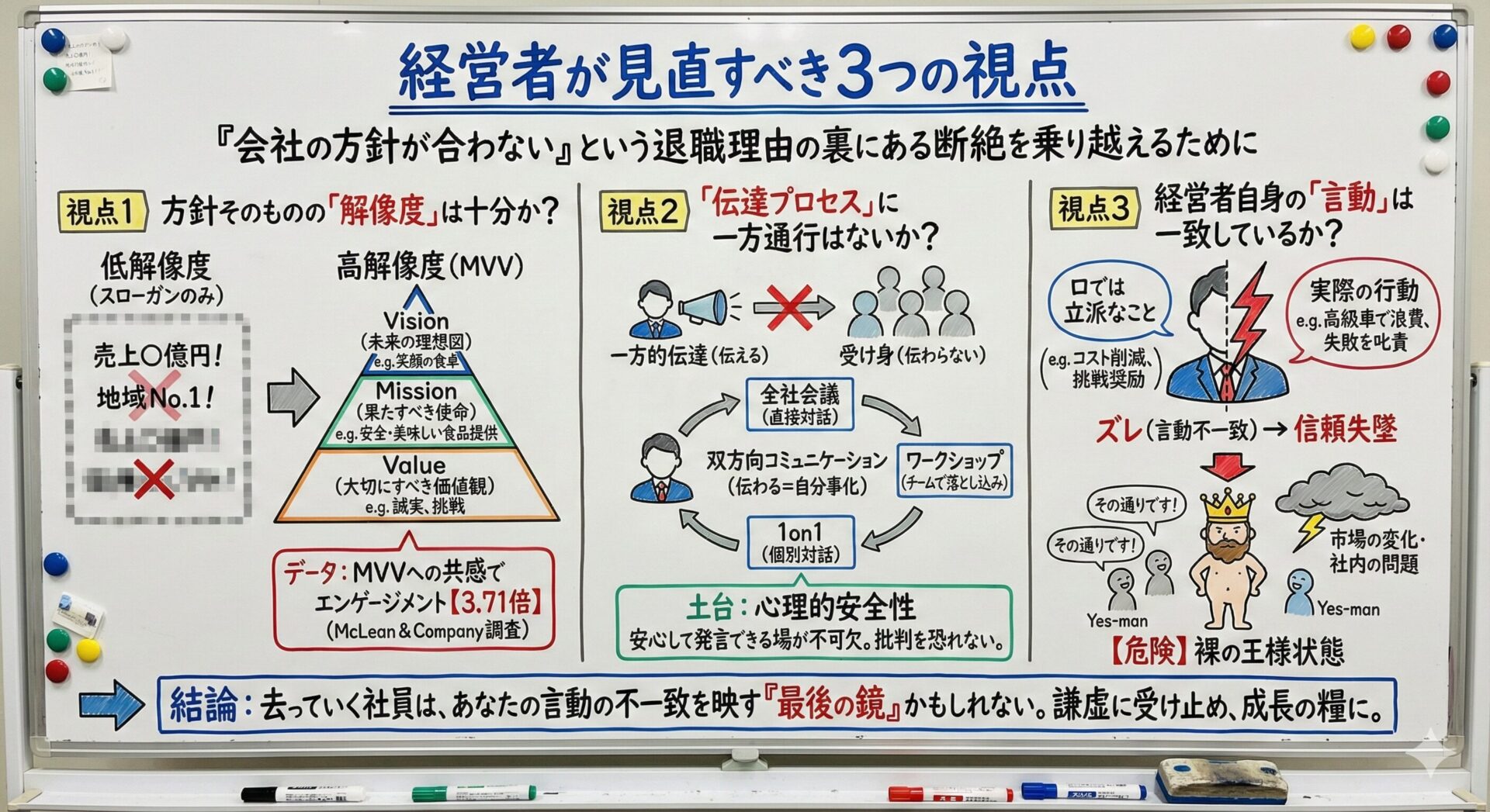 経営者は、社員にとって「会社の象徴」です。その経営者の言動が掲げる方針と一致していなければ、どんなに立派な方針も空虚な言葉にしか聞こえません。人間的な信頼関係がなければ、人々はついてきません。しかし、経営トップに対して面と向かって「あなた自身が信頼できません」などと言うことはできないため、「会社の方針と私の考えが合いませんでした」という、間接的な表現に落ち着くのです。