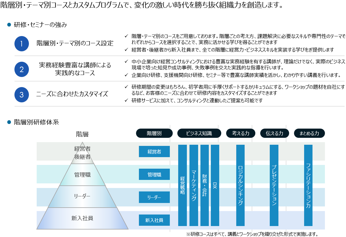 私たちの研修・セミナーは、こうした悩みを解決し、中小企業の成長戦略を強力に後押しします。